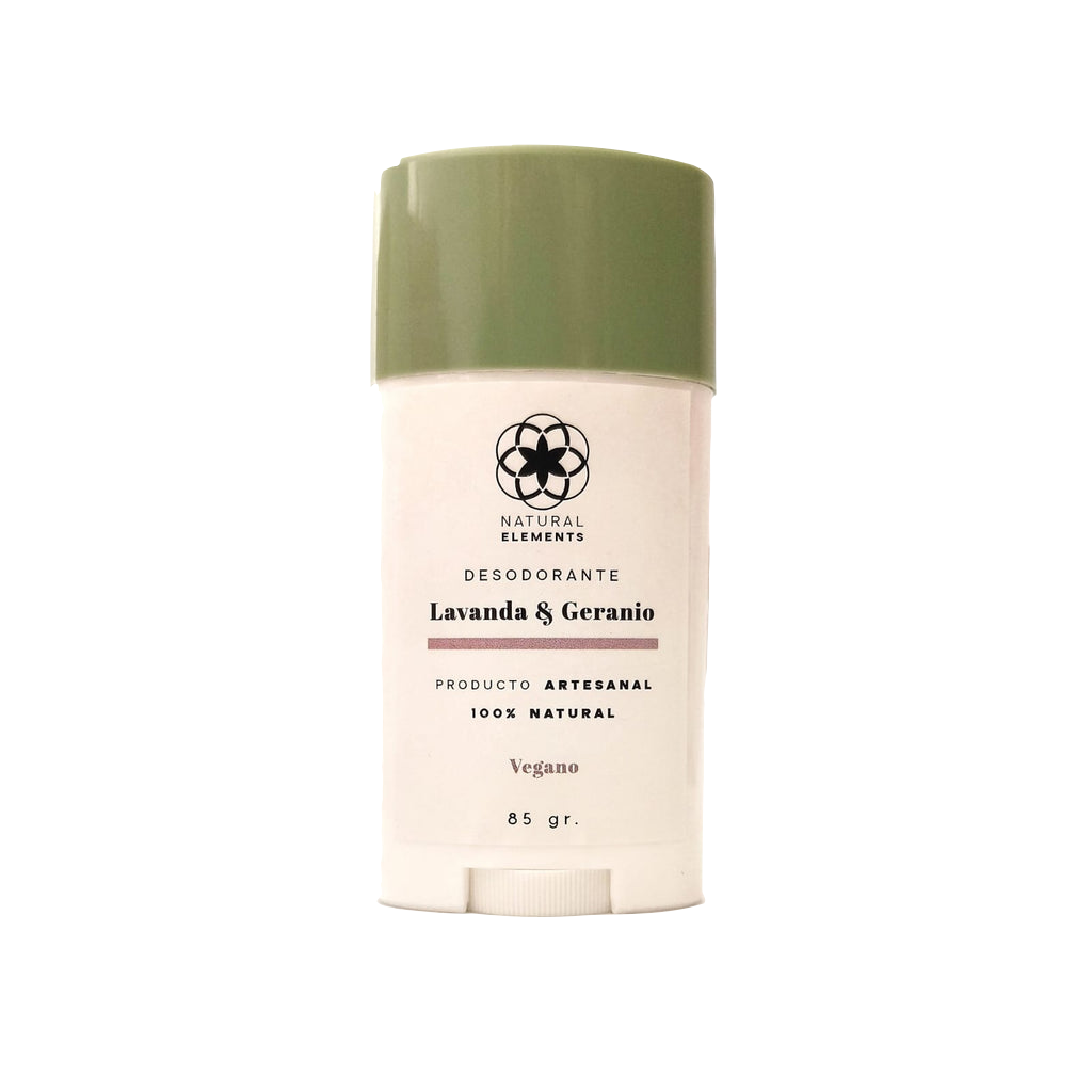 Desodorante vegano de lavanda y geranio en barra, elaborado con ingredientes 100% naturales.